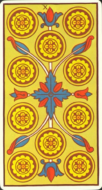 The 10 of Pentacles represents material posessions. The number 10 of Pentacles forms the links to the Ace (first card) of Wands (the first suit in the minor Arcana), and thus prepares to bring you back to the beginning of the minor Arcana, ready for a next cycle through the tarot.