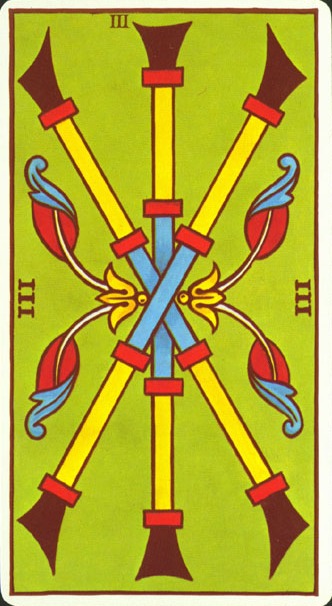 This card is about exposing your new ideas to the world. The Wand's element fire goes well with the number 3, as 3 is an output number, a number of results. Fire likes getting to results quickly.