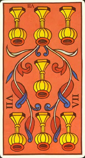 The 7 of Cups is about making a choice between different ideals. But Cups, with the water element, don't like making definitive choices that much, making this 7 in this suit a bit of a hard choice.