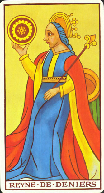 The Queen in the suit of Pentacles becomes aware of her Earthly attributes; she's reliable and sober, able to give good advice.