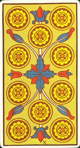 The 10 of Pentacles represents material posessions. The number 10 of Pentacles forms the links to the Ace (first card) of Wands (the first suit in the minor Arcana), and thus prepares to bring you back to the beginning of the minor Arcana, ready for a next cycle through the tarot.