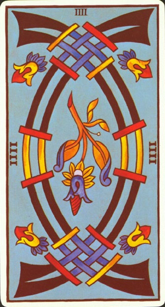 4 is the first number in the cycle of giving things shape. It's about making things real. The element of Swords also relates to making things real, so this enhances the effect so much that arrogance can cause you to exhaust yourself.