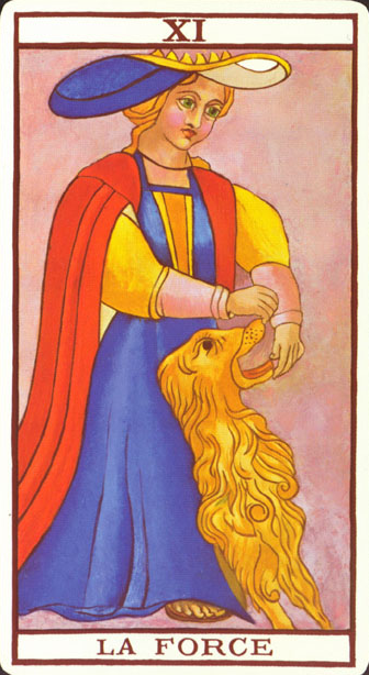 This card carries the number 11. In the Rider-Waite deck, Strength and Justice have swapped places because Waite saw links with the astrological signs Leo and Libra.