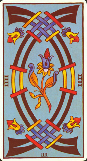 4 is the first number in the cycle of giving things shape. It's about making things real. The element of Swords also relates to making things real, so this enhances the effect so much that arrogance can cause you to exhaust yourself.