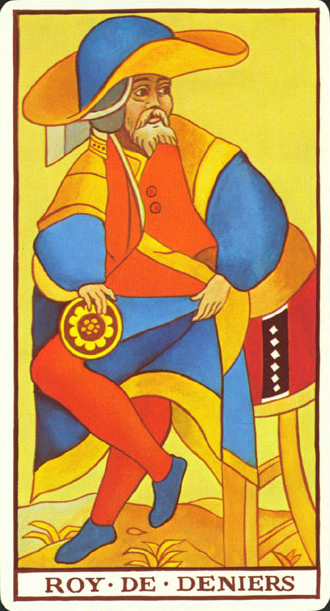 The King of Pentacles uses his Earthly attributes to rule. He goes about his work like an old style business man; he avoids unnecessary risks, aims for real results, and acts from confidence.