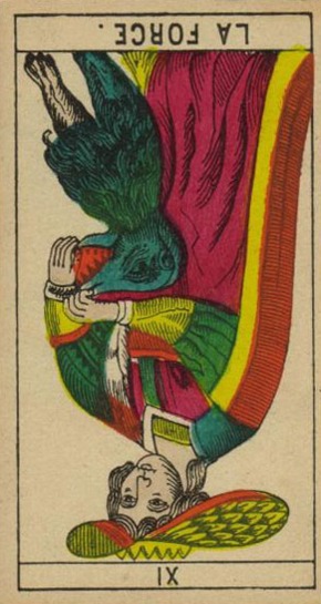 This card carries the number 11. In the Rider-Waite deck, Strength and Justice have swapped places because Waite saw links with the astrological signs Leo and Libra.