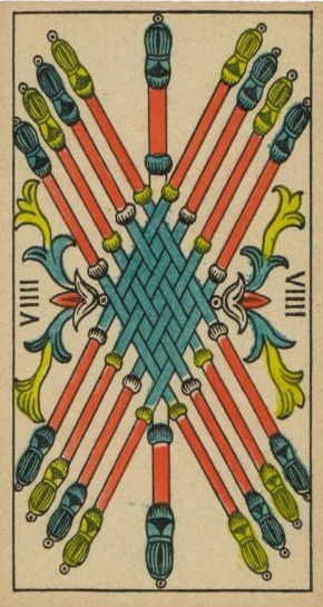 The 9 represents rest after work, which is another thing (like 8) that the element Fire associated with Wands is not very comfortable with. Fire likes to keep going. This rest will probably be spent thinking about what to do next along the course to completion.