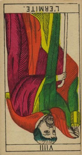 The Hermit shuts out the world and retreats into solitude to better understand some spiritual aspect of life. He opens to the cosmos and lets it's wisdom sink in. Hermits are often seen as wise old men who can guide a traveller along a journey.