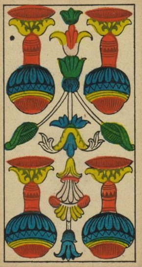 With the 4, the second cycle of this suit is commenced, where a choice between structure and feeling has to be made, where old securities have to be let go of to work towards a new future. But like Wands, Cups don't like structure much, they prefer to be free and dream rather than to make commitments and go for something.