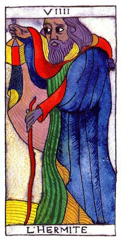 The Hermit shuts out the world and retreats into solitude to better understand some spiritual aspect of life. He opens to the cosmos and lets it's wisdom sink in. Hermits are often seen as wise old men who can guide a traveller along a journey.