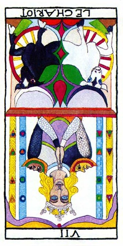 During the prevous card, The Lovers, all the wisdom of the first cards in the deck has been processed and a choice was made for personal growth. Now it's time to do something with all this baggage, to actually travel the road. A lot has been done so far, wisdoms have been accumulated and integrated into one's personality.