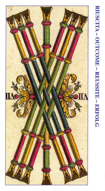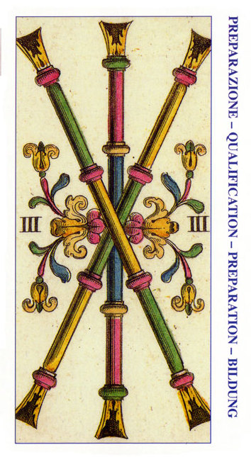 This card is about exposing your new ideas to the world. The Wand's element fire goes well with the number 3, as 3 is an output number, a number of results. Fire likes getting to results quickly.