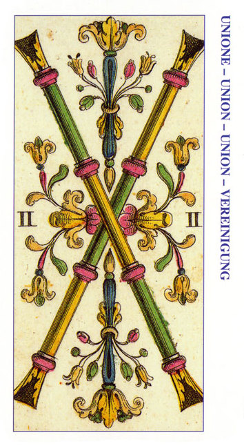 The 2 of Wands represents the research and digestion of a new idea. The number of this card and it's element are somewhat in conflict; while the 2 is focussed inwards, the Wand's element fire is outgoing. Fire wants to steam ahead while the blackbox 2 asks for patience.