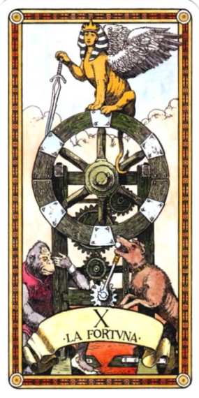 With the Wheel of Fortune, the second major cycle of Tarot commences. The first cycle in the first cards of the deck was about development as a child, accumulating wisdoms and integrating them into your personality. This second cycle is about your development as an adult. It is a more demanding cycle. You'll have to see if you can face what the world throws at you.