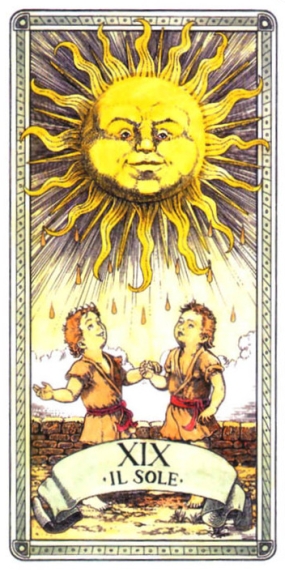 The Sun carries the number 19, a composed value of 1. This is the third composed 1 in the Major Arcana. It's the culmination of the 1's. The third 1 is a reward and a beginning at the same time. It also represents creative energy.