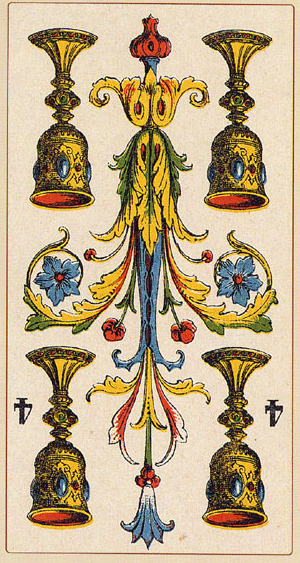 With the 4, the second cycle of this suit is commenced, where a choice between structure and feeling has to be made, where old securities have to be let go of to work towards a new future. But like Wands, Cups don't like structure much, they prefer to be free and dream rather than to make commitments and go for something.