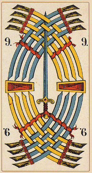 The 9 of Swords represents relief from cropped-up grief. The number 9 is a number of reward and rest and accomplishment. In the element of Swords there is not a lot of time for rest, but without any rest you'd just burn yourself out.