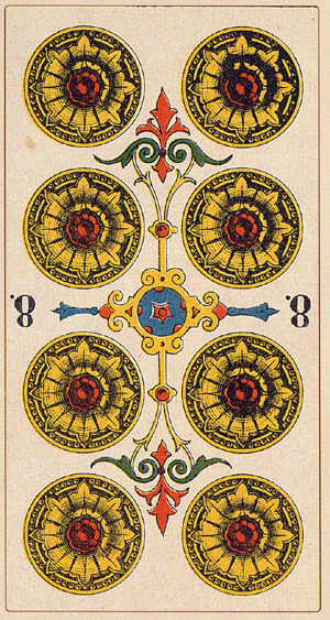 The 8 of Pentacles is about keeping up the hard work you're doing, and trying to be happy about doing that work at the same time. While the 3 of Pentacles is about completing a masterpiece, the 8 of Pentacles is about doing the apprentice work that makes you a master of your trade.