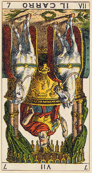 During the prevous card, The Lovers, all the wisdom of the first cards in the deck has been processed and a choice was made for personal growth. Now it's time to do something with all this baggage, to actually travel the road. A lot has been done so far, wisdoms have been accumulated and integrated into one's personality.