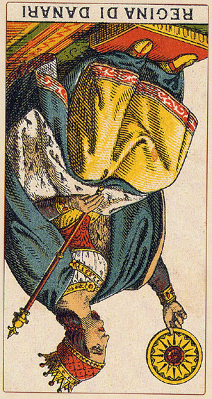 The Queen in the suit of Pentacles becomes aware of her Earthly attributes; she's reliable and sober, able to give good advice.