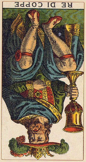 The King of Cups uses his intuition to achieve his ideals. Since Cups are turned inward, and Kings turned to the outside world, this card might be a difficult one, or it could be a powerful one.