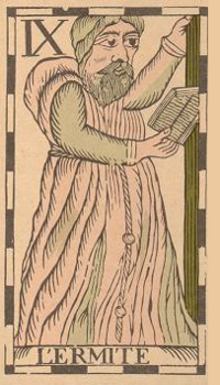 The Hermit shuts out the world and retreats into solitude to better understand some spiritual aspect of life. He opens to the cosmos and lets it's wisdom sink in. Hermits are often seen as wise old men who can guide a traveller along a journey.