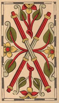 The 2 of Wands represents the research and digestion of a new idea. The number of this card and it's element are somewhat in conflict; while the 2 is focussed inwards, the Wand's element fire is outgoing. Fire wants to steam ahead while the blackbox 2 asks for patience.
