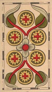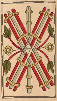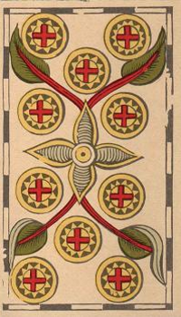 The 10 of Pentacles represents material posessions. The number 10 of Pentacles forms the links to the Ace (first card) of Wands (the first suit in the minor Arcana), and thus prepares to bring you back to the beginning of the minor Arcana, ready for a next cycle through the tarot.