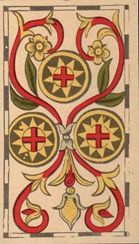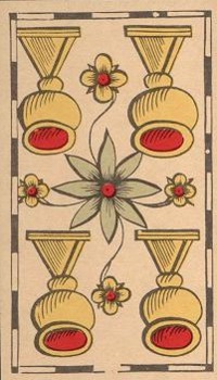 With the 4, the second cycle of this suit is commenced, where a choice between structure and feeling has to be made, where old securities have to be let go of to work towards a new future. But like Wands, Cups don't like structure much, they prefer to be free and dream rather than to make commitments and go for something.