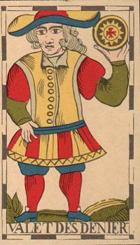 Pages explore and gather information about the road ahead, with an almost naive attitude. The Page of Pentacles is sometimes described as a bridge builder; Pentacles is the suit where the actual work is done, and the Page here enables those that follow to quickly cross difficult terrain.