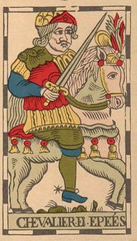 The Knight of Swords lacks the naivety of the Knight of Wands, he has analyzed the terrain ahead and weighed his options there. He knows what his own nature can throw into the mix, but does not let himself be held idle by that. The activities ahead will likely include the solving of conflicts and problems on your road to your ideal.