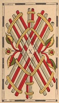 The 10 of Wands is therefore the transition from the element Fire (associated with Wands) to the element Water, associated with Cups. As you might imagine, this not the easiest of transitions.