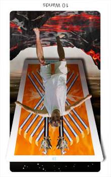 The 10 of Wands is therefore the transition from the element Fire (associated with Wands) to the element Water, associated with Cups. As you might imagine, this not the easiest of transitions.