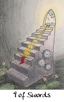 The 9 of Swords represents relief from cropped-up grief. The number 9 is a number of reward and rest and accomplishment. In the element of Swords there is not a lot of time for rest, but without any rest you'd just burn yourself out.