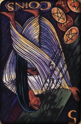 The 5 of Pentacles is an assignment-number card, and is about letting go of your securities. Pentacles element Earth (also) represents material posessions, so this card is about letting go of (some of) your worldly assets.