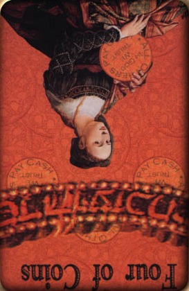 The 4 of Pentacles is about holding on to what you got. The number 4 represents structure and order, and fits well with the suit's element, Earth.