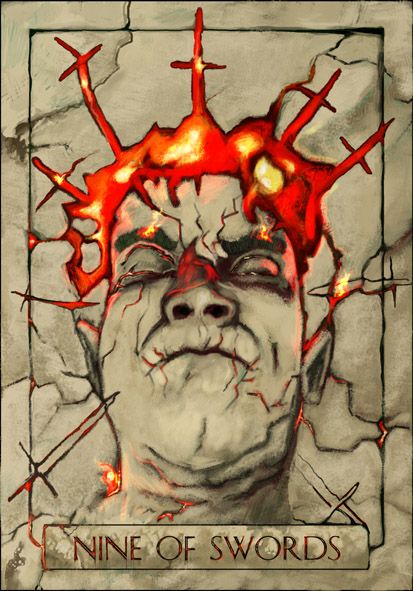 The 9 of Swords represents relief from cropped-up grief. The number 9 is a number of reward and rest and accomplishment. In the element of Swords there is not a lot of time for rest, but without any rest you'd just burn yourself out.