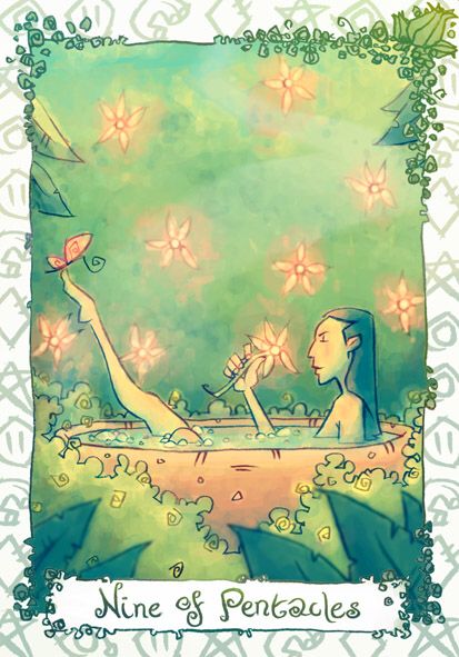 The 9 of Pentacles represents earned rest. The element Earth, attached to the Pentacles suit, appreciates the rest that completion of hard work brings. This is a good time for games and relaxation.