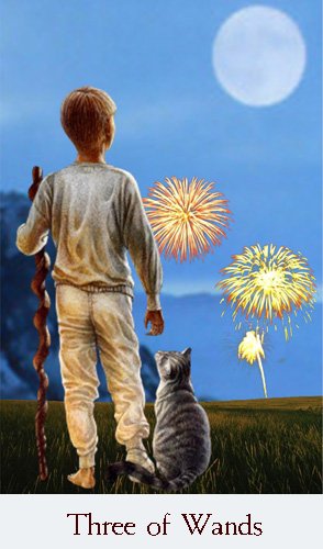 This card is about exposing your new ideas to the world. The Wand's element fire goes well with the number 3, as 3 is an output number, a number of results. Fire likes getting to results quickly.
