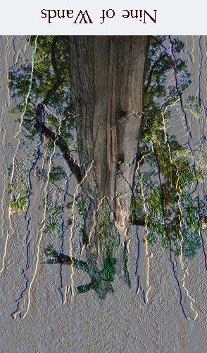 The 9 represents rest after work, which is another thing (like 8) that the element Fire associated with Wands is not very comfortable with. Fire likes to keep going. This rest will probably be spent thinking about what to do next along the course to completion.