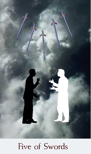 The 5 of Swords is about facing reality. The 5 is an assignment number, and in the slighly more difficult suit of Swords, it means you face a difficult challenge where your past experiences could hold you down.