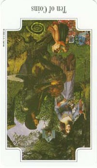 The 10 of Pentacles represents material posessions. The number 10 of Pentacles forms the links to the Ace (first card) of Wands (the first suit in the minor Arcana), and thus prepares to bring you back to the beginning of the minor Arcana, ready for a next cycle through the tarot.