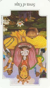 The 7 of Cups is about making a choice between different ideals. But Cups, with the water element, don't like making definitive choices that much, making this 7 in this suit a bit of a hard choice.