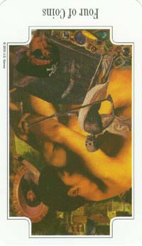 The 4 of Pentacles is about holding on to what you got. The number 4 represents structure and order, and fits well with the suit's element, Earth.