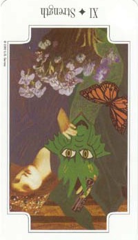This card carries the number 11. In the Rider-Waite deck, Strength and Justice have swapped places because Waite saw links with the astrological signs Leo and Libra.