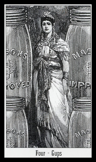 With the 4, the second cycle of this suit is commenced, where a choice between structure and feeling has to be made, where old securities have to be let go of to work towards a new future. But like Wands, Cups don't like structure much, they prefer to be free and dream rather than to make commitments and go for something.