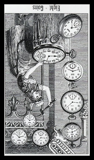 The 8 of Pentacles is about keeping up the hard work you're doing, and trying to be happy about doing that work at the same time. While the 3 of Pentacles is about completing a masterpiece, the 8 of Pentacles is about doing the apprentice work that makes you a master of your trade.