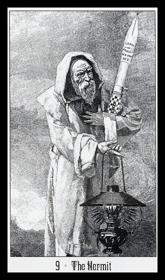 The Hermit carries the number 9. This is the highest base number. After 9 the composed numbers emerge. Therefore the number 9 is the gateway to a higher order. It is also a place to rest before embarking on the next leg of the journey.