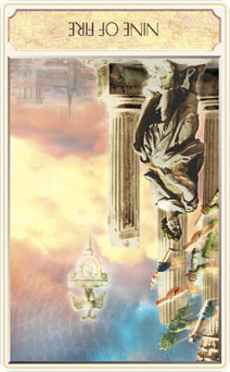 The 9 represents rest after work, which is another thing (like 8) that the element Fire associated with Wands is not very comfortable with. Fire likes to keep going. This rest will probably be spent thinking about what to do next along the course to completion.