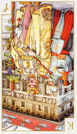 The King of Wands uses the properties of Wands (vitality, optimism, enthousiasm) to go out with confidence. He is seen as a leader with charisma.